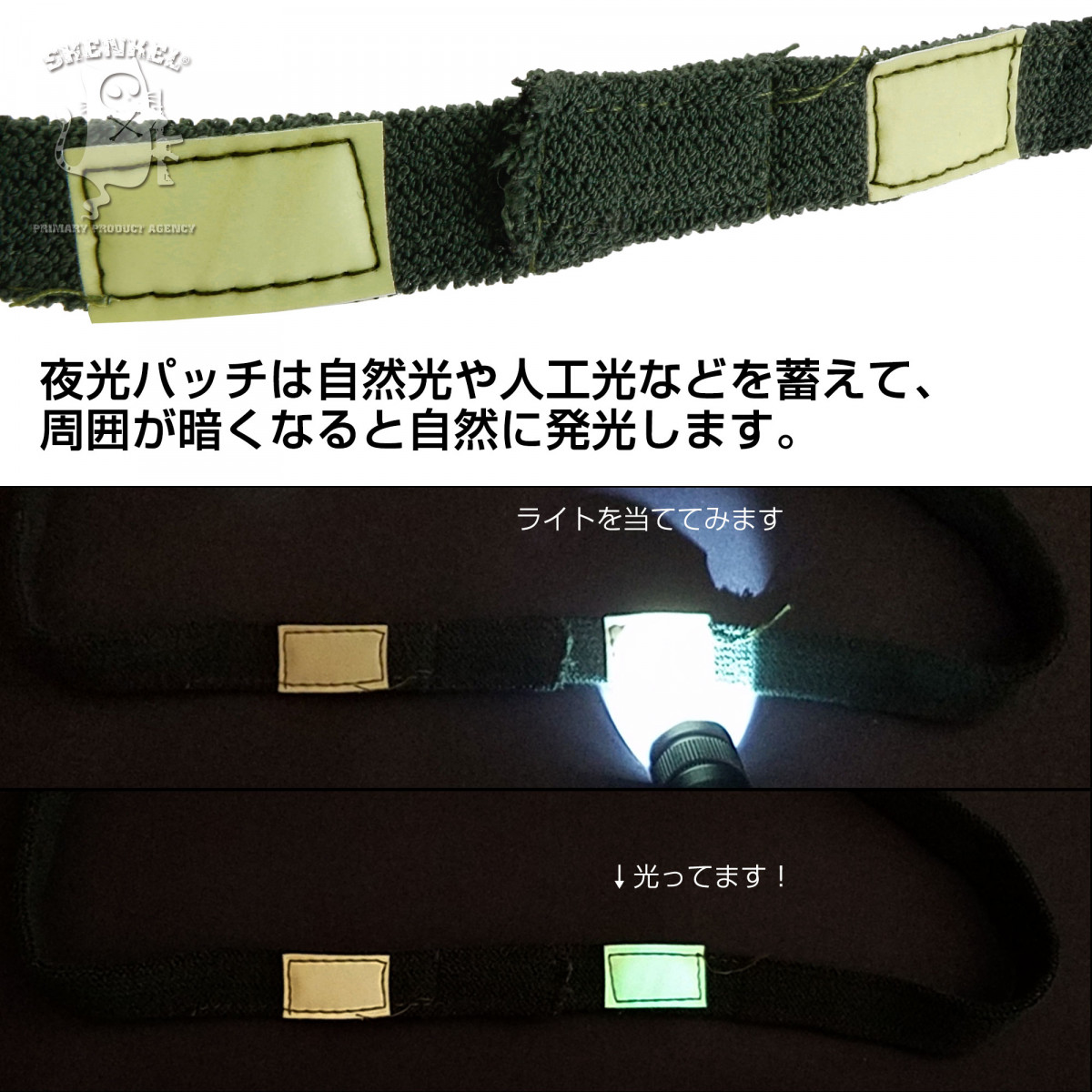 ヘルメットバンドには夜光パッチ(キャッツアイ)が2つ付いており、暗闇でも味方の識別が容易になります。夜光パッチは自然光や人工光などを蓄えて、周囲が暗くなると自然に発光します。