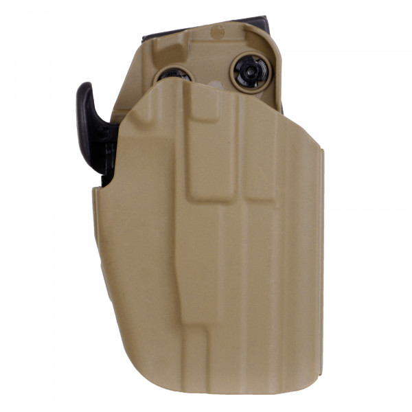 シーソー式のシンプルなロックプレートがトリガーガードをロックするGLS(グリップロッキングシステム)を再現。ホルスターからハンドガンを取り出す際のグリップを握るという動作で自然にロックが解除されます。